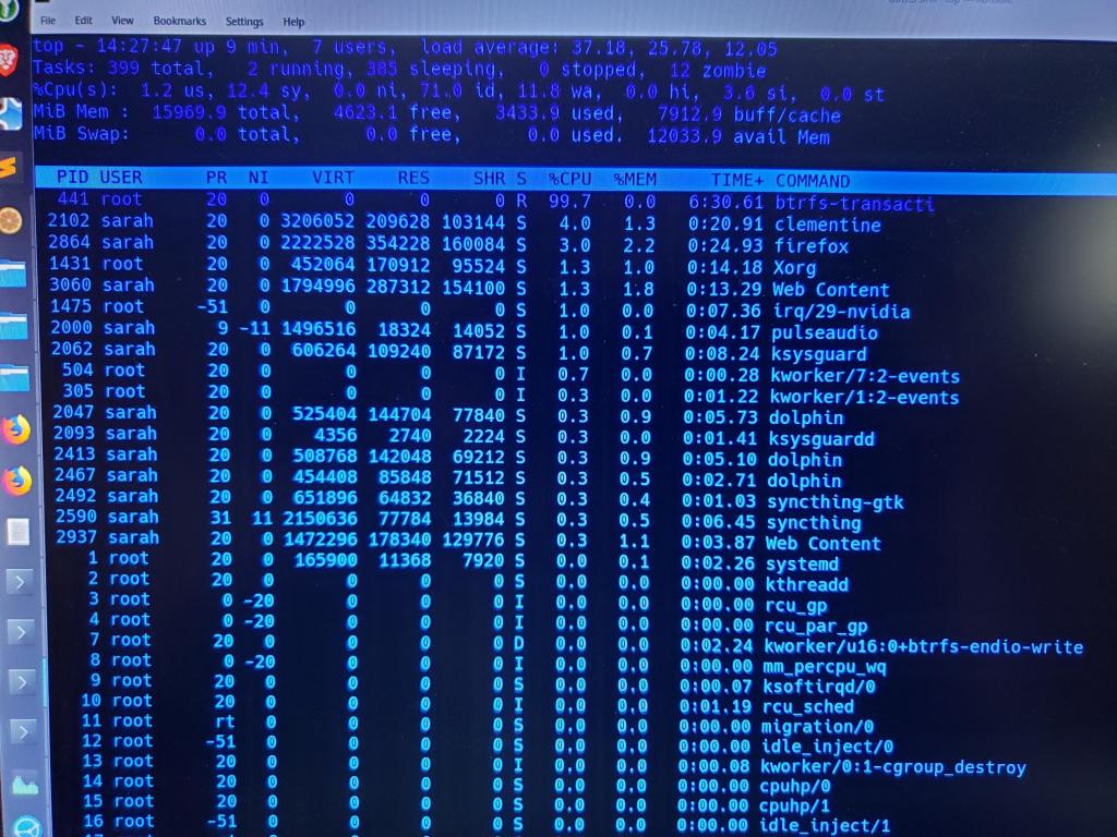 There is some `btrfs-transaction` going on (I have no idea what the source was, or how to find out).