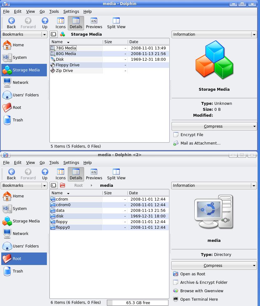 Please take a look at the attached screenshot. In Dolphin (top), the 78G Media is my kubuntu HD. Why is Dolphin showing this mounted when it's the root drive? That's the same as seeing the drive itself mounted to one of its own subfolders ?? In Dolphin (Bottom), you can see what happens when I go into any of the selections from the top screen and then come back again -- the listing cites only the folder names and the Kubuntu HD is not listed on itself as it is in the top window; it changes!
