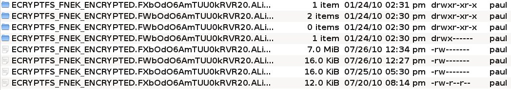 In my /home directory is a link entry, ".Private". It points to a directory containing files whose names begin with, "ENCRYPTFS_FNEK_ENCRYPTED... Some of these files bear very recent time stamps, like today's date. I don't remember ever setting up an encrypted file system, much less adding entries today. The OS (Lucid) seems to operate flawlessly. What's going on