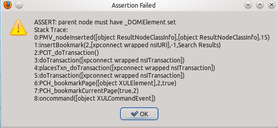 If I attempt to add a bookmark to Firefox I get a "Failed Assertion" error.
