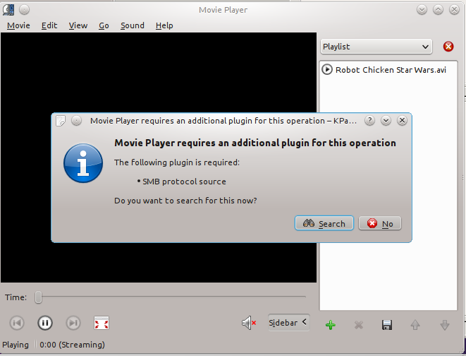 Now, after a fresh install of Kubuntu 11.04 I can't play those shared files even though I installed Totem. See attached screen shot for error. If screen shot doesn't appear it says, "the following plugin is required: SMB protocol source".