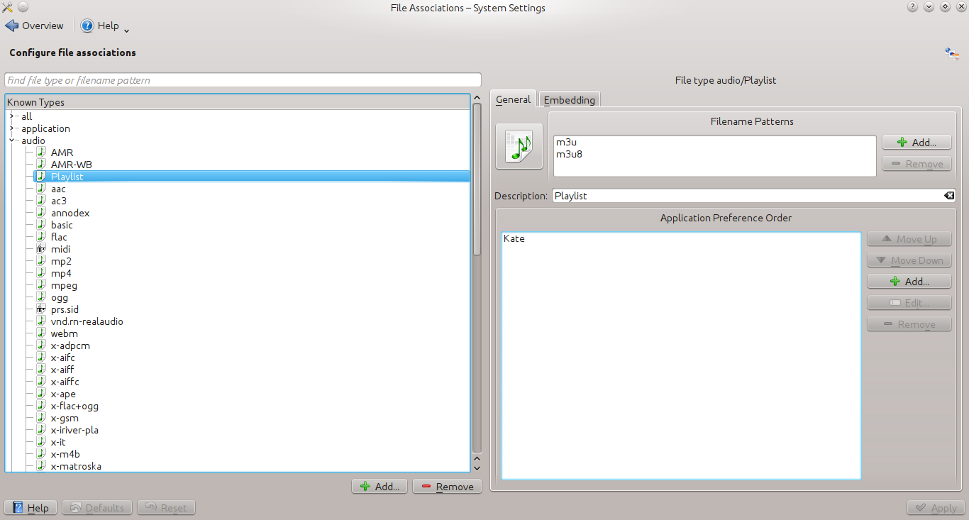 I'm trying to arrange to have Playlist files with extension m3u be opened by Kate. I set that up in System Settings/ File Associations, but it doesn't seem to take. Opening the file Play3.m3u invokes Sound Converter instead. I've attached a screenshotof File Associations. What am I missing?