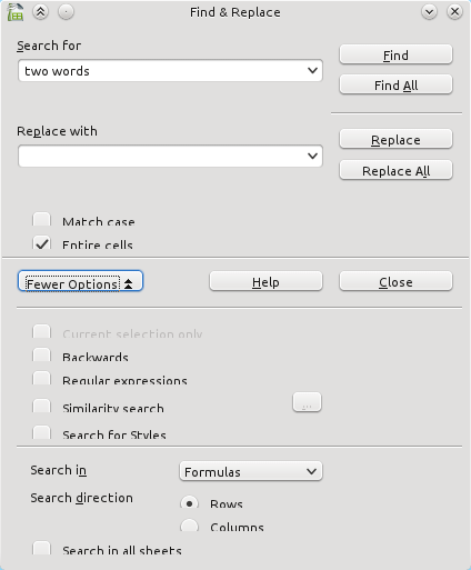 I open in Calc the "Find & Replace" box [strg+f] and write "two words" in it,