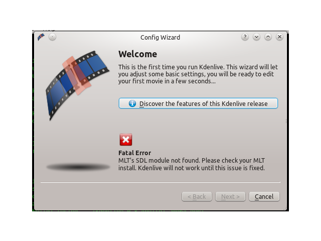Installed Kdenlive from Muon. Install went fine but when I try to run the application, I get a screen pop-up that says: