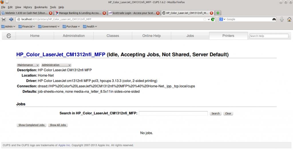 Notice the address displayed by Firefox for this printer, namely: localhost:631/printers/HP_Color_LaserJet_CM1312nfi_MFP