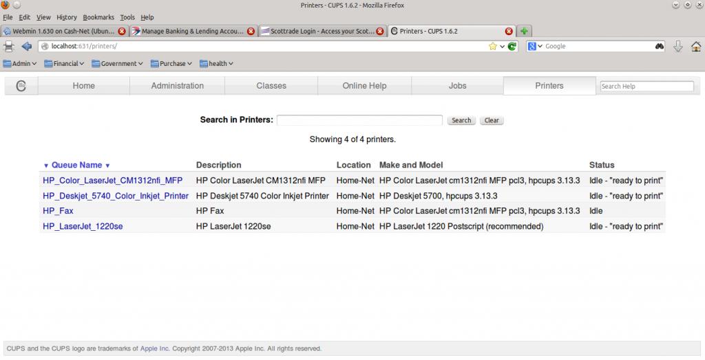 Now on the laptop, when I open Firefox and open the CUPS page, I get 8 printers (the Fax function on the Color LaserJet CM1312nfi MFP counts as a separate printer). On the Desktop, CUPS shows only 4 printers.