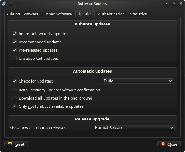 Thanks! I could have sworn I had added that repo as it's always necessary to stay current. I must have missed it. Knew it was something simple!Originally posted by whatthefunk View PostIts not in the Ubuntu repos yet. Its in a Kubuntu ppa which isnt activated by default. See Rog132s post: http://www.kubuntuforums.net/showthr...ghlight=update