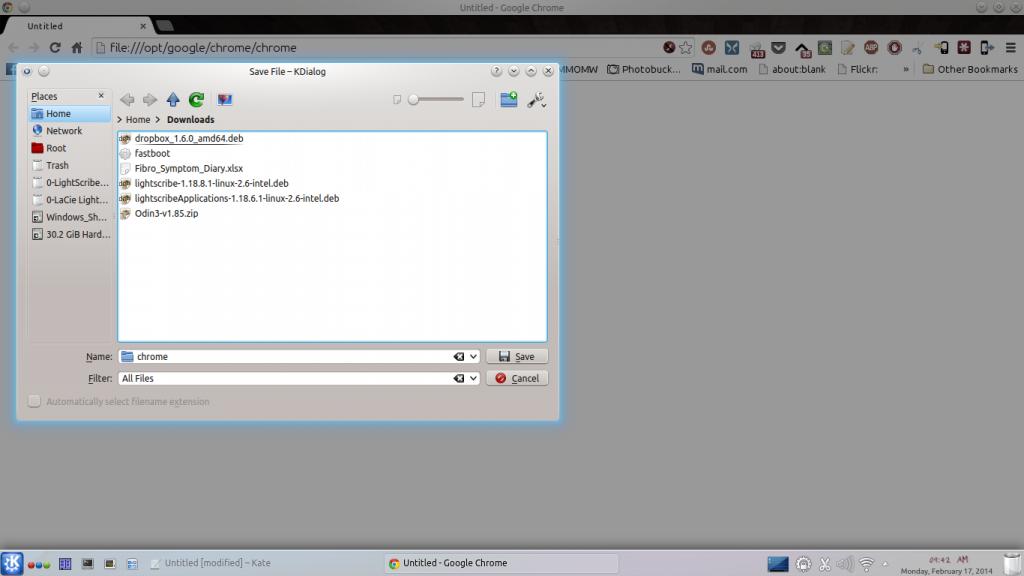 I opened my Google Chrome, right clicked on the task bar icon, and selected "Show a Launcher When not Running", The next time I tried to open Chrome with the icon/app launcher, Chrome opened, then a dialogue box opened asking for confirmation to download a file, " file: file:///opt/google/chrome/chrome". It does this every time I open Chrome. The thread I mentioned earlier, all of his launchers would open Chrome to that download, mine is only Chrome, the rest work correctly. Here's a snapshot of Chrome opening.