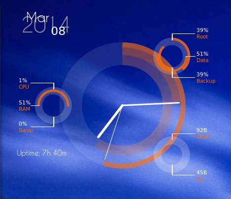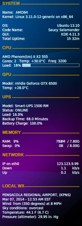 Okay, I suppose I'm bragging a little. Since SuperKaramba seems to have "issues" with Saucy, I decided to give Conky a try. After 2 weeks of scripting, researching, updating, and more scripting, I finally have something I'm proud of. So, for anyone having trouble with Conky, feel free to edit my conky.rc for your own use.