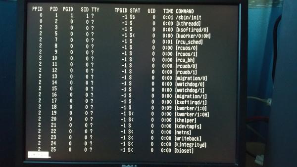UID        PID  PPID  C STIME TTY          TIME CMDroot         1     0  0 15:40 ?        00:00:01 /sbin/init