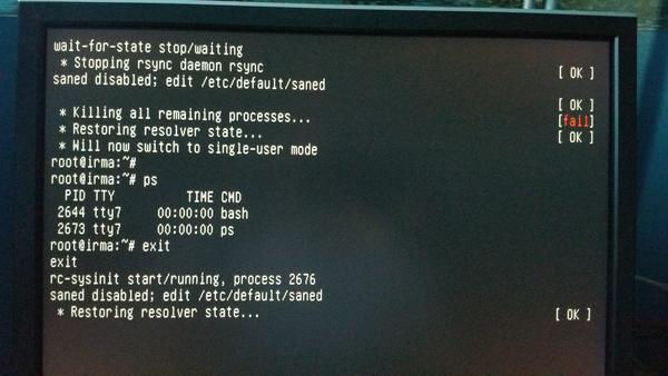 Current boot options are 'advanced' which allows me to choose the recovery screen, and I can then choose grub, fsck, root shell, etc. from the recovery menu. I chose root shell after a clean boot and then ran the ps command to see which process I should try to kill. The output was pretty sparse: