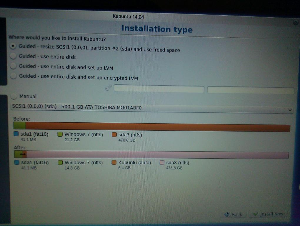 On two of the laptops, the guided resize of the hard drive worked perfectly. It took the 478 GB NTFS and cut it in half, and then put Kubuntu on it.