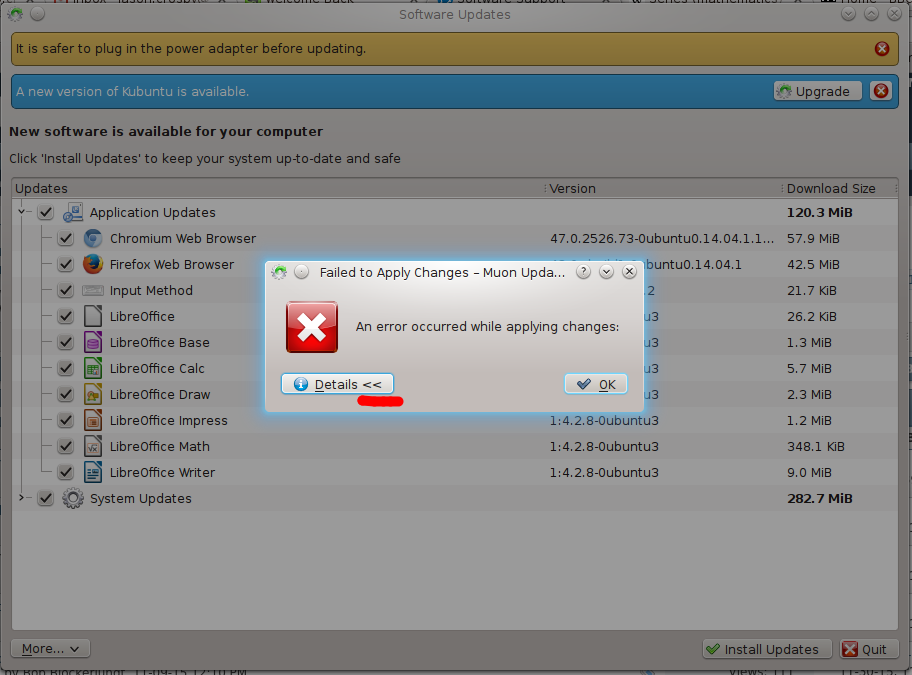 But Muon update manager still doesn't work; it downloads the new packages but doesn't install, and doesn't give me any information about why.