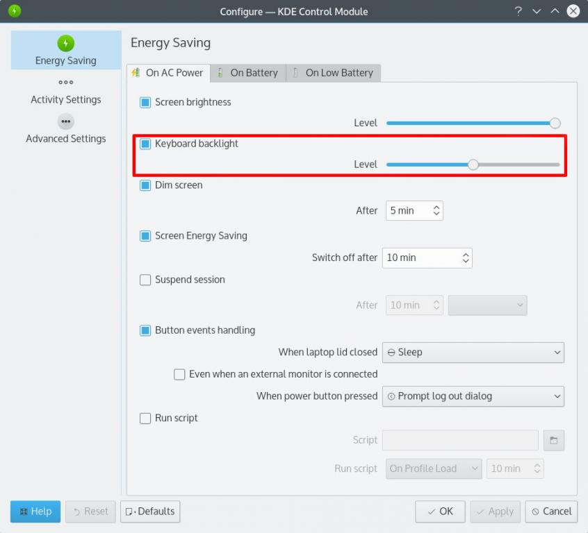 Now I would like to solve another small problem. Energy Saving fails to manage the keyboard backlight. Precise manual adjustment of this feature works well (using shortcuts FN + F3 & Fn + F4), while in Energy Saving, nothing happens. Instead the screen brightness is perfectly handled automatically by the energy management.