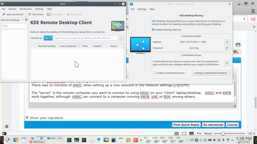 In the image above KRDC is on the left and KRFB is on the right. KRFB is run on the computer you want to connect to. KRDC is run on the computer in front of you. KRFB is a VNC so that is the setting you will want to use. Also, this pair uses port 5900 so you will have to open your firewall (on both machines) to that port for two way traffic. If you have a firewall on your router you'll need to open it up on port 5900 as well.