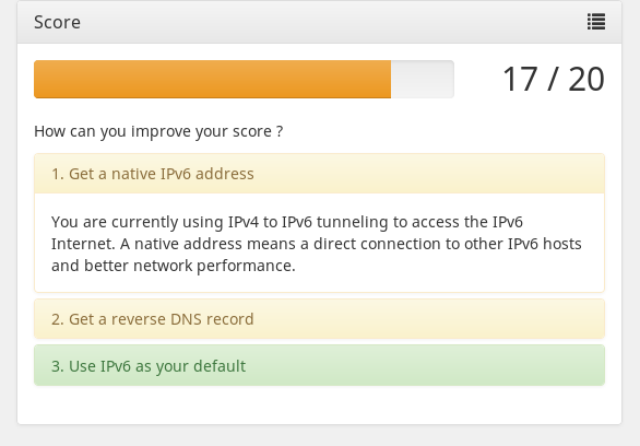 to the ufw rules and also edited the NetworkManager entries created by miredo to add the IPv6 DNS numbers for Google's IPv6 DNS, but those rules won't stay, so DNS is sketchy. However, all in all, it is working OK. My "Quality" of connection varies between 14 and 17 on ipv6-test.com, as my activity and use of IPv6 varies. That is due to my Linksys E2500 router, which has DD-WRT on it. The version of DD-WRT on my router does not support IPv6 so I can't turn off suppression of the IPv6 ping. If the three items left on the "todo" list all are controlled by my IPS, TW, which isn't serving IPv6 to residents in my area.