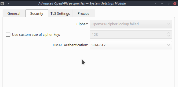 I'm trying to add a VPN connection with OpenVPN through the Network Manager. Everything goes fine when importing the .opvn file except for the last step when I want to choose the security mode.