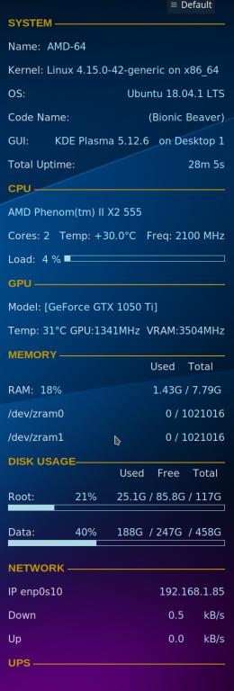 I figured out how to display my NAS drive under Disk Usage > Data, but only when it's mounted to my system, otherwise Data is the last entry. I was surprised I could use an if / endif statement in the TEXT section. Anyway, to my question. Does anyone know how I can format the Memory > /dev/zram0 and zram 1 lines so the bytes are in MB? The output is actually