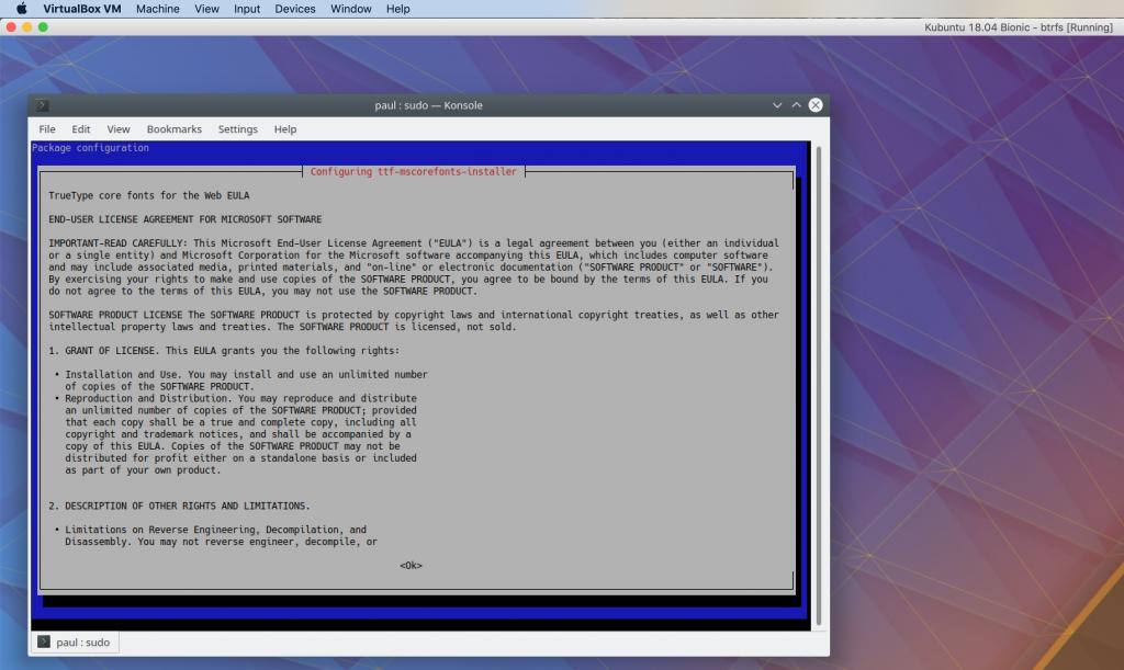 Here, in my 18.04, I just initiated the installation of ttf-mscorefonts-installer from the Command Line (sudo apt-get install ttf-mscorefonts-installer). This is the EULA screen that appears immediately: