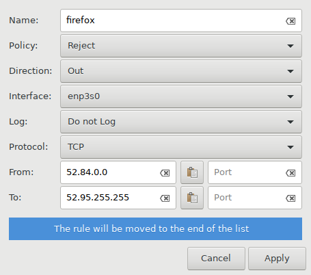 I would like to block ip ranges from outgoing connections. This is an example of a rule I've created; It does not work.