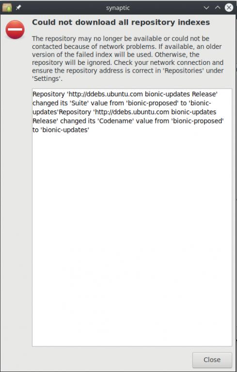 Repository 'http://ddebs.ubuntu.com bionic-updates Release' changed its 'Suite' value from 'bionic-proposed' to 'bionic-updates'Repository 'http://ddebs.ubuntu.com bionic-updates Release' changed its 'Codename' value from 'bionic-proposed' to 'bionic-updates'