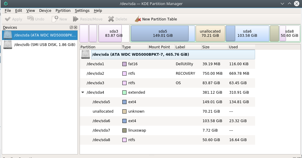 Code:kubuntu@kubuntu:~$ sudo fdisk -lu Disk /dev/loop0: 1.5 GiB, 1561763840 bytes, 3050320 sectors Units: sectors of 1 * 512 = 512 bytes Sector size (logical/physical): 512 bytes / 512 bytes I/O size (minimum/optimal): 512 bytes / 512 bytes Disk /dev/sda: 465.8 GiB, 500107862016 bytes, 976773168 sectors Units: sectors of 1 * 512 = 512 bytes Sector size (logical/physical): 512 bytes / 4096 bytes I/O size (minimum/optimal): 4096 bytes / 4096 bytes Disklabel type: dos Disk identifier: 0x9a91e749 Device Boot Start End Sectors Size Id Type /dev/sda1 63 80324 80262 39.2M de Dell Utility /dev/sda2 * 81920 1617919 1536000 750M 7 HPFS/NTFS/exFAT /dev/sda3 1617920 177500584 175882665 83.9G 7 HPFS/NTFS/exFAT /dev/sda4 177502206 976766975 799264770 381.1G f W95 Ext'd (LBA) /dev/sda5 177502208 490000383 312498176 149G 83 Linux /dev/sda6 637235200 854462463 217227264 103.6G 83 Linux /dev/sda7 854465283 870658739 16193457 7.7G 82 Linux swap / Solaris /dev/sda8 870658803 976766975 106108173 50.6G 7 HPFS/NTFS/exFAT Partition 1 does not start on physical sector boundary. Partition 4 does not start on physical sector boundary. Partition 7 does not start on physical sector boundary. Partition 8 does not start on physical sector boundary. Disk /dev/sdb: 1.9 GiB, 2004877312 bytes, 3915776 sectors Units: sectors of 1 * 512 = 512 bytes Sector size (logical/physical): 512 bytes / 512 bytes I/O size (minimum/optimal): 512 bytes / 512 bytes Disklabel type: dos Disk identifier: 0x39076aac Device Boot Start End Sectors Size Id Type /dev/sdb1 * 0 3162975 3162976 1.5G 0 Empty /dev/sdb2 3136968 3141703 4736 2.3M ef EFI (FAT-12/16/32) kubuntu@kubuntu:~$