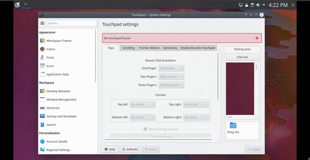 The touchpad works: I can move the mouse pointer and use the left and right touchpad buttons for clicking. However, the section in Input Devices > Touchpad is greyed out as seen in the image. All tabs in there have their options greyed out.