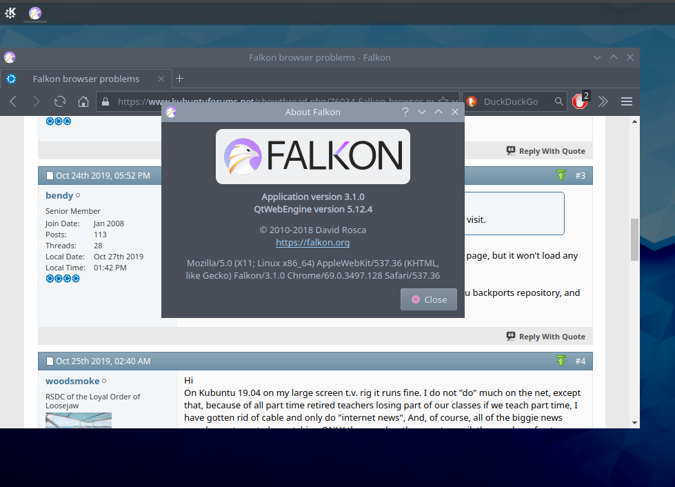 Is anyone else using the Falkon browser, and if so are you having any problems with it in 19.10? It worked fine for me in 19.04, with I just upgraded to 19.10, but now I can't open web pages - getting an error message: