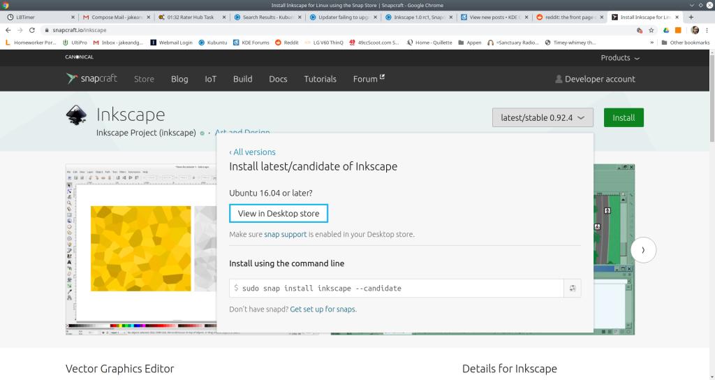 The Snapcraft store has a link open in Discover. Which then only shows the 0.92 snap. It does not have channel options for the "--candidate" snap. This is a Kubuntu/Discover deficit according to Popey of snapcraft/canonical
