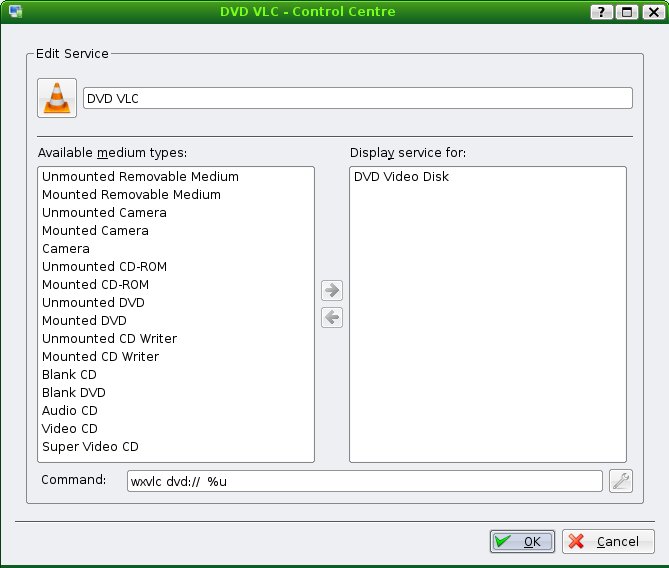 Is there a way to set VLC to play as the default player for DVD movies? I've added it to the list of applications under "kcontrol" --> "Peripherals" --> "Storage Media" --> "Notifications" but when I select it, I get the following error: