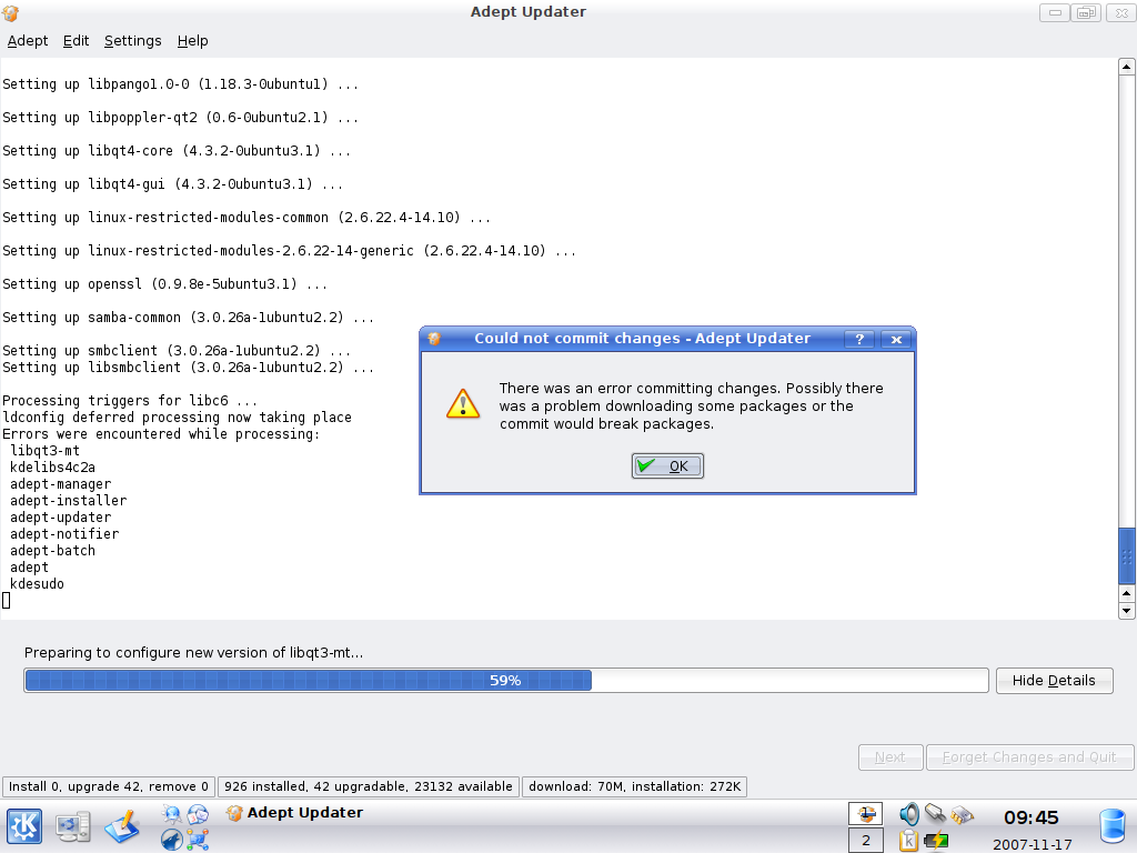 I've just installed Gutsy on my laptop. (I had trouble with the update so I backed up the home directory and started over) I downloaded a live CD on Nov. 16th and installed from it. As soon as the install finished, I installed 3 restricted drivers (modem, wireless, and video) (very slick, by the way) and then ran the adept automatic update. download seemed to go well, but just over halfway through, I got one of the "there was an error committing changes..." messages.
