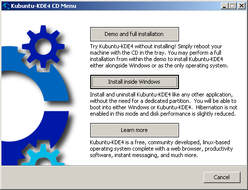 As for the KDE thing, it's probably installing the KDE windows manager in Windows which is fairly new and in beta. It won't install Kubuntu within windows....srrry....unless someone comes along that has a better answer.