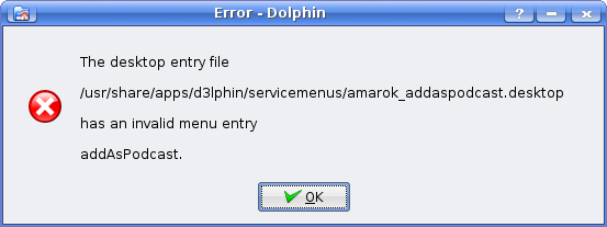 I have installed Kubuntu 8.04 and I am very happy with it. However, a weird error message pops up in Dolphin everytime I click on a file. It happens both when I right or left click. How can I get rid of this error message? See the attached file for details.