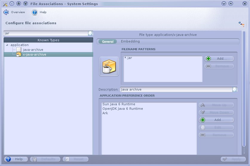 JAR files are not recognized independently from ZIP files, both types are opened with ark. My filetypes associations are as follow:
