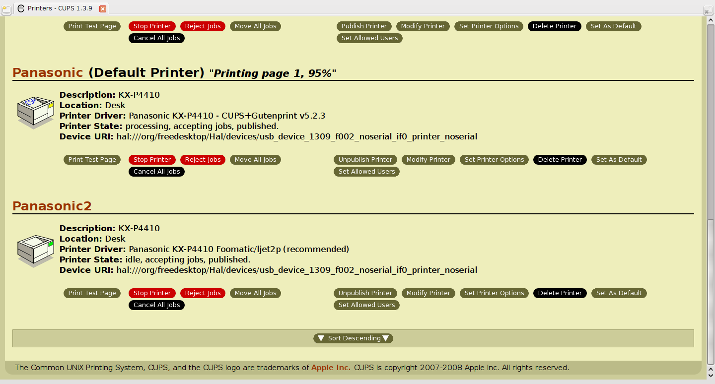 Okay, this has been a problem long enough. My USB connected (directly connected from the laptop) laser printer (Panasonic KX-P4410) isn't seen by the OS, nor of course, by CUPS 1.4.1. I have hplip-cups (and hplip) installed, and according to the description: