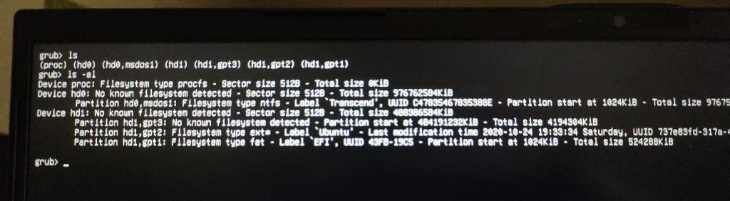 What can I do from a GRUB prompt to get back in business? Its list of commands, displayed by pressing [tab], is very short.