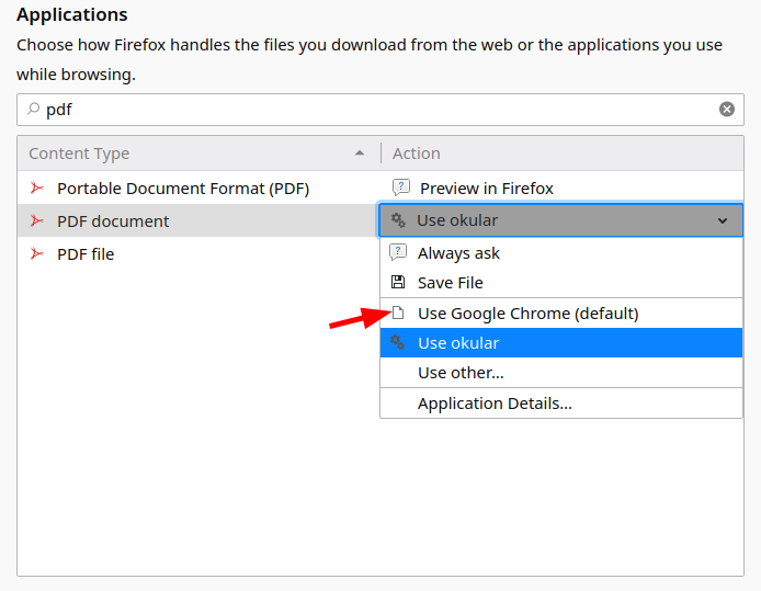 It automatically opens Chrome for that. Is there any way I can change that? AFAICT my KDE default PDF viewer is set to Okular. This is specific to Firefox so I am guessing it could be related to some GTK default application setting.