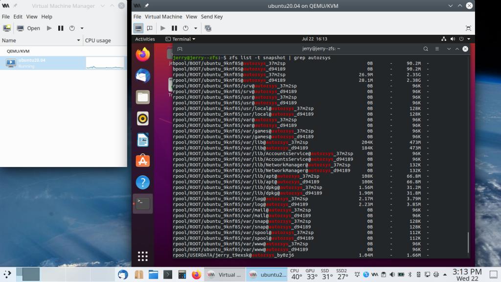 The first thing I did after I got Ubuntu 20.04 installed was an apt update and full-upgrade. I had read that zsys, Ubuntu's version of Snapper, creates snapshots before apt is run. When I opened a terminal and did "zfs list -t snapshots" what I got was a couple dozen snapshots with cryptic names. I purged zsys because I want to do the snapshots manually, and when I want to do them.