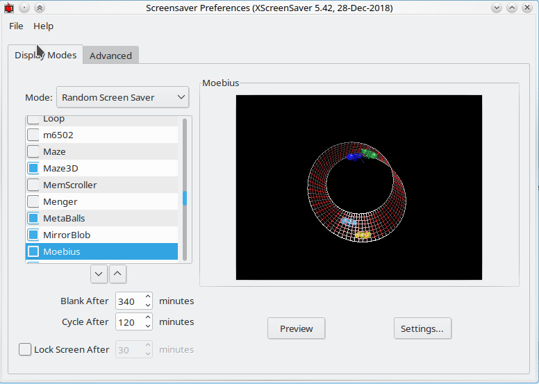 And then I made sure xscreensaver was there. It does run upon startup of the machine. It brings up the GUI that lets you choose if you want a random or a specific screen saver. However, I leave that on, but the screensaver does not come up when I haven't been using the PC. So then I went to: