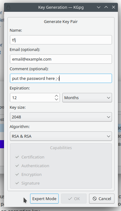 I can't generate key pairs in KGpg (Kleopatra works fine) the "ok" button is grayed out.