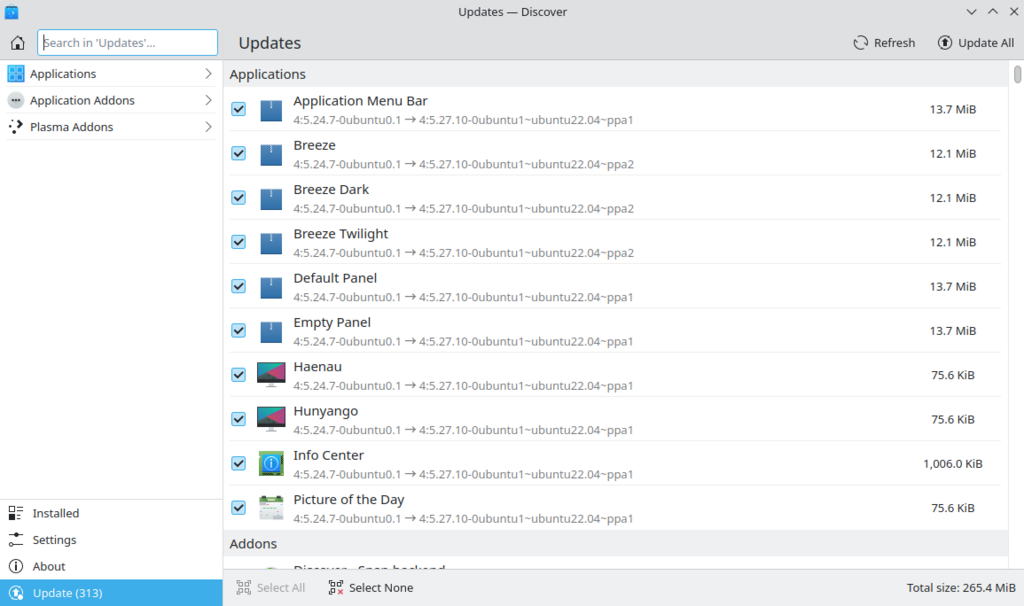 Before December, any packages I had installed on my Kubuntu LTS 22.04.3 laptop as normal system packages (be they through the Ubuntu repos, PPAs, or downloaded deb files) were all listed individually in Discover. Trying to update any and all of them required me to input my password after hitting "update selected" in Discover.