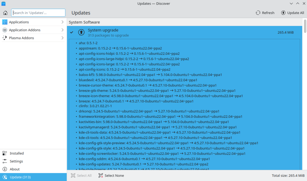 Starting in December, however, all packages installed this way, regardless of origin, have been getting lumped together into one big update option, labeled "System Upgrade." This would include core libraries and programming languages, to things like Spotify and Google Chrome. That is, somewhere, Discover started viewing all of these as the same.