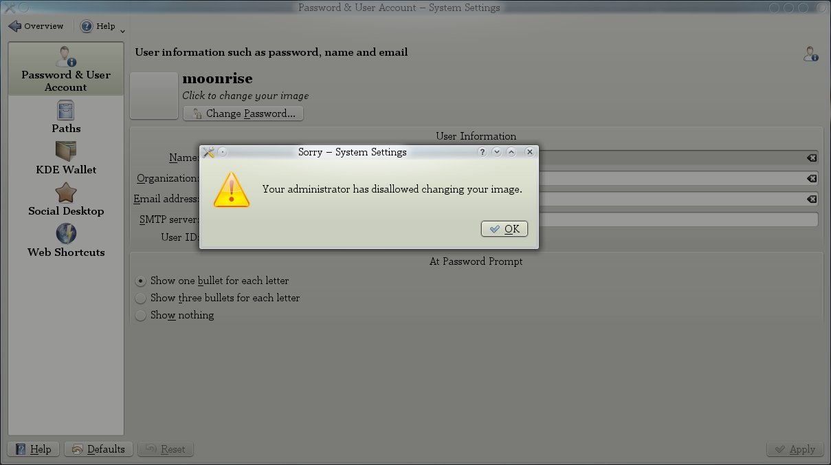 System Settings > Account Details > Password & User Account > click to change your image and you get told "Your adminstrator has disallowed changing your image."