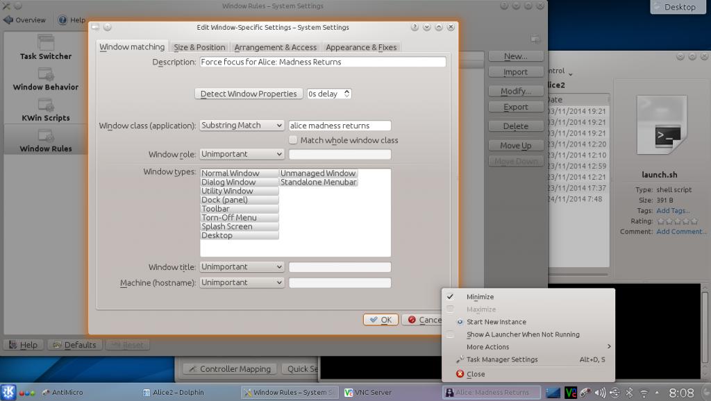 The Kwin rules were the one category in that dialogue I didn't try, looks like a cool feature. It didn't seem to have any effect on the game, I tried with "exact match" of "Alice: Madness Returns" and "contains string" of "alice madness returns" (in case the colon was causing problems) with a rule which forced not minimised and forced focus, but it didn't seem to have an effect (screenshot included). Interestingly, I found out in the process that the window is minimised, not just out of focus.