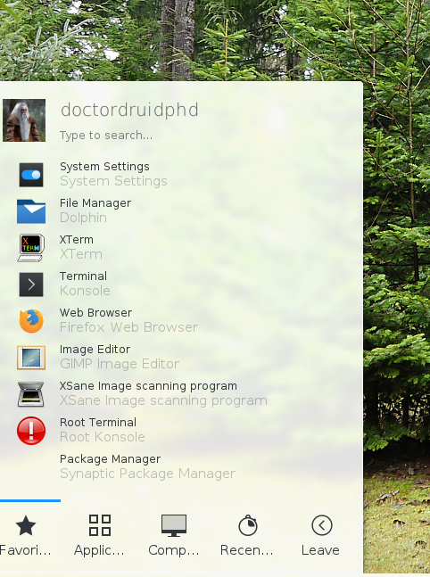 First, the Kickoff menu. Note that the space for Synaptic is blank.
