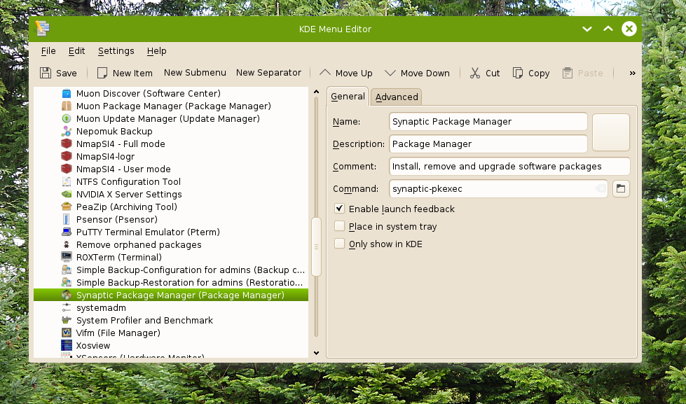 Here is the application editor. Note in the menu for synaptic, the icon is there, but in the editor, it is missing.