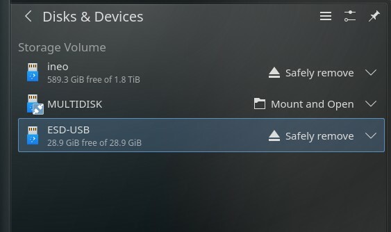 So, on Unity 7, when a USB stick or hard drive was attached, it would pop up on the launcher, until it would be unmounted. I quite liked that behaviour. Can it be done with KDE? I found Disk & Devices applet but it is not dynamic and I cannot tell how many devices I have got attached. Googling have not given me much either but I am new to KDE terminology and I am still not sure what things are called (things that go on a panel are widgets, indicators are basically app launchers and applets are another name for widgets - Latte which I started to use might be confusing me here:-)). Is there anything like what I described available?